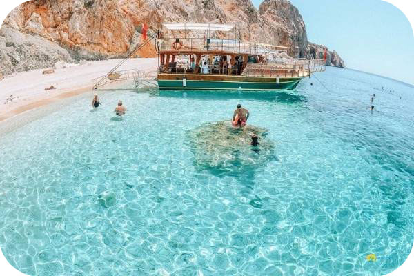 ٣- مالديف تركيا (Suluada): وصلنا إلى “نجم الرحلة” وأشهر وجهة حالياً في السياحة في أنطاليا. جزيرة سولوادا، أو كما يسمونها “مالديف تركيا”، ستذهلكم برمالها البيضاء الناصعة ومياهها التركوازية المشعة. المشهد هنا خيالي وكأنكم في حلم؛ مكان مثالي لالتقاط صور “إنستغرامية” لا تُصدق، والسباحة في مياه شفافة ترى قاعها بوضوح.