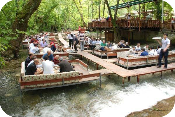٢- مطاعم نهر أولوبينار (Ulupınar): بعد جولة الجبل، يحين وقت الغداء في مكان لا مثيل له. تشتهر منطقة “أولوبينار” بمطاعمها الفريدة حيث توضع الطاولات والجلسات مباشرة “داخل” مجرى النهر البارد وتحت ظلال الأشجار العتيقة. ستستمتعون بتناول الأسماك الطازجة والمشاويات وصوت خرير الماء يداعب آذانكم. الجلسة هنا “باردة وتسرسح على القلب” وتنسيكم حرارة الصيف تماماً.