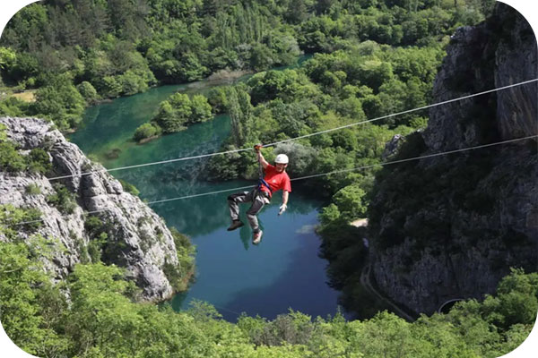 2. Zipline: Fly over the canyon! Add an extra dose of adrenaline by gliding on a steel cable across the river. Feeling the wind in your face while suspending high above the turquoise water offers a unique perspective of the national park and is a thrilling addition to your rafting adventure.